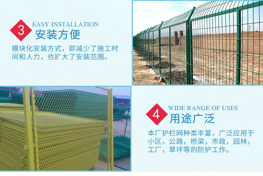 護欄網,這種網格結構簡練、美觀實用、便于運輸,安裝不受地形起伏限制,對于山地、坡地、多彎地帶適應性特強,具有其他結構隔離柵無法比擬的優點。